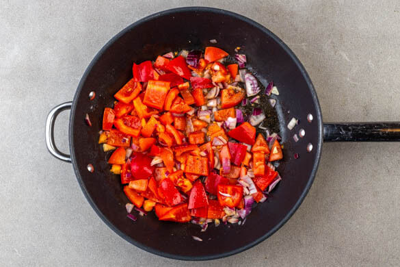 In einem mittelgroßen Topf 600ml leicht gesalzenes Wasser für den Reis zum Kochen bringen. Die Paprika halbieren, entkernen und in grobe Würfel schneiden. Die Zwiebeln schälen, halbieren und grob würfeln. Den Knoblauch schälen und in feine Scheibchen schneiden. Die Tomaten grob würfeln.