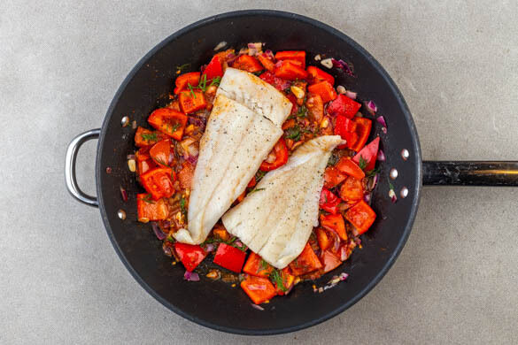 Den Fisch mit kaltem Wasser abspülen, trocken tupfen und evtl. vorhandene Gräten mit einer Pinzette entfernen, dann mit je 1 Prise Salz und Pfeffer würzen. Die Gewürzmischung und die ½ des Dills unter die Gemüsepfanne rühren und den Fisch vorsichtig mittig auf das Gemüses legen.