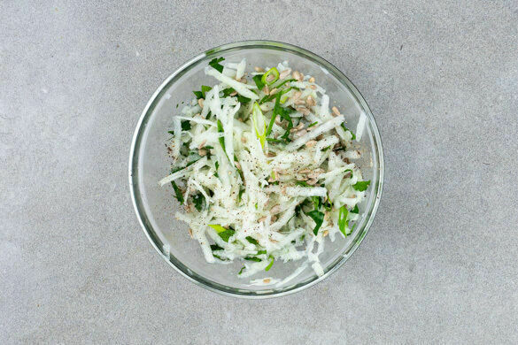 Den Kohlrabi schälen und mit einer Küchenreibe grob raspeln. Die übrigen Lauchzwiebeln, die Petersilie, die Sonnenblumenkerne, den restlichen Zitronensaft, 2EL Olivenöl und 1EL Einlegflüssigkeit von den Zwiebeln dazugeben und alles gut vermengen. Den Salat gut mit Salz und Pfeffer abschmecken.