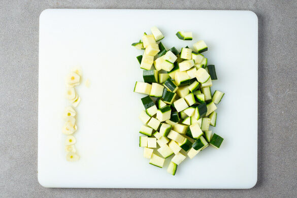 In einem mittelgroßen Topf ausreichend gesalzenes Wasser für die Pasta zum Kochen bringen. Die Zucchini der Länge nach vierteln und in kleine Würfel schneiden. Den Knoblauch schälen und in feine Scheibchen schneiden.
