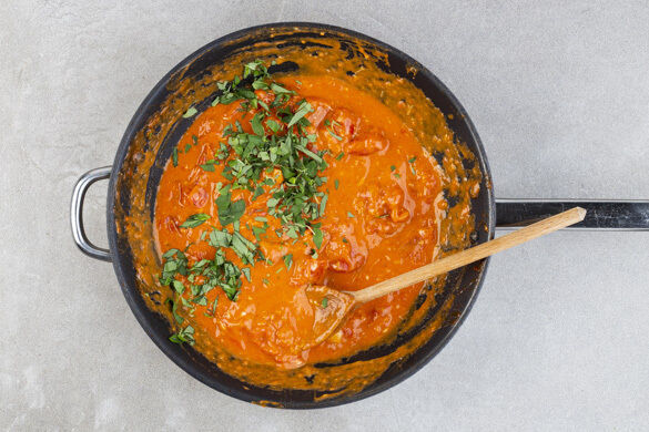 Die Saucenpfanne vom Herd nehmen. Die Eier verquirlen und in die Sauce gießen, dabei stetig langsam rühren. Die Sauce wieder auf den Herd stellen und 2–3Min. erwärmen, bis sie eine samtige Textur annimmt. Dann ca. ⅔ der Kräuter unterrühren und mit Salz und Pfeffer abschmecken.