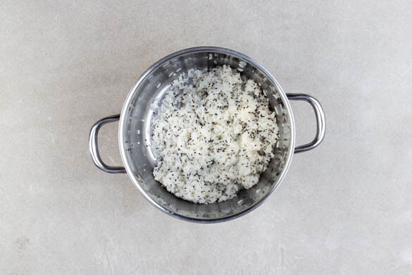Den Sesam unter den Reis heben. Den Blumenkohl mit der Sauce und dem Sesamreis anrichten und servieren.