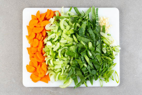Die weißen und grünen Teile des Pak Choi getrennt in ca. 1cm breite Streifen schneiden. Die Karotte ggf. schälen, längs halbieren und schräg in dünne Scheiben schneiden. Die Lauchzwiebel schräg in dünne Ringe schneiden, den grünen und den weißen Teil getrennt aufbewahren. Den Knoblauch schälen und fein würfeln.