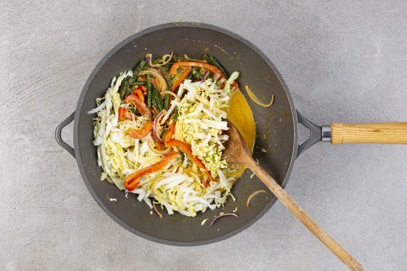 Die Bohnen in einer großen Pfanne oder einem Wok mit 1EL Pflanzenöl bei starker Hitze 4–5Min. anbraten. Die Paprika und die Zwiebeln dazugeben und 1Min. mitbraten. Die 1/2 der Currypaste oder mehr nach Geschmack unterrühren, dann mit der Kokosmilch ablöschen. Den Chinakohl unterrühren, mit Salz und Pfeffer abschmecken und alles noch 1Min. köcheln lassen.