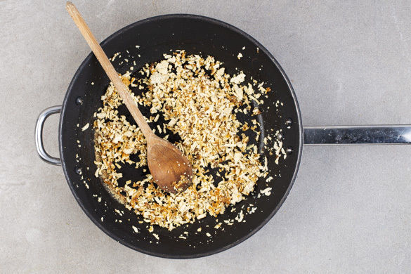 In einem großen Topf ausreichend gesalzenes Wasser für die Nudeln zum Kochen bringen. Mit etwas Küchenkrepp so viel Flüssigkeit wie möglich aus dem Tofu pressen und den Tofu anschließend mit einer Küchenreibe grob raspeln. In einer mittelgroßen Pfanne mit 1–2EL Pflanzenöl bei starker Hitze ca. 5Min. anbraten.