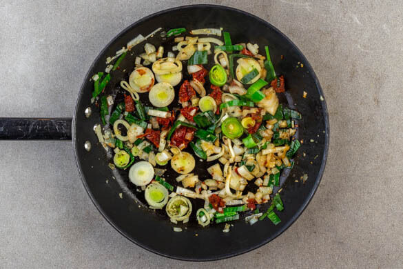 Den Lauch und die Zwiebeln in der Pfanne bei mittlerer Hitze in 3–5Min. weich braten. Währenddessen die getrockneten Tomaten grob würfeln. Das Gemüse mit 1EL Essig ablöschen und den Bratensatz mit einem Kochlöffel lösen. Die getrockneten Tomaten und die Gewürzmischung einrühren und ca. 1Min. mitbraten.