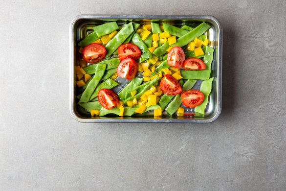 Die Bohnen, die Paprika und die Tomaten in eine Auflaufform oder auf ein Backblech geben und mit 1–2TL Olivenöl sowie Salz und Pfeffer vermengen. Im Ofen 6–8Min. rösten, bis sich die Bohnen dunkelgrün verfärben und die Paprika an den Enden leicht zu bräunen beginnt.