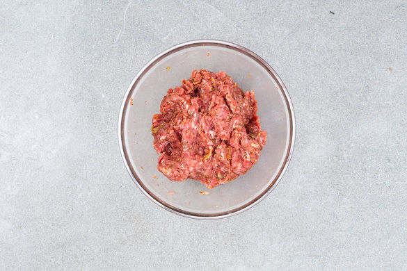 Den Backofen auf 200°C Umluft (220°C Ober-/Unterhitze) vorheizen. Das Hackfleisch mit den Feigen, der Gyros-Gewürzmischung sowie Salz und Pfeffer gut verkneten und beiseitestellen.
