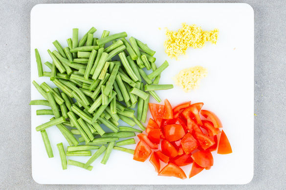 Die Enden der Bohnen entfernen und die Bohnen in ca. 2cm lange Stücke schneiden. Die Tomaten in 1–2cm große Stücke schneiden, dabei den Strunk entfernen. Den Ingwer und den Knoblauch schälen und fein reiben.