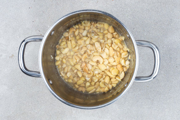 Die Cashews und ca. 3/4 der Mandeln in einem kleinen Topf mit 200ml Wasser und ca. 1/3 des Brühgewürzes ca. 10Min. bei mittlerer Hitze kochen.