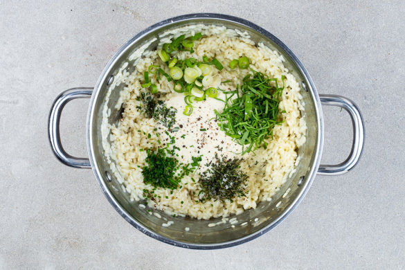 Ein Gericht von frühlingshafter Leichtigkeit, überaus köstlich und vegan: Das Risotto wird mit einer Mandel-Cashew-Sauce und einem Kräutermix aus Sauerampfer, Zitronenthymian, Rosmarin und Schnittlauch verfeinert. Das bunte Gemüse – Radieschen, Karotte und Kohlrabi – wird im Ofen gegrillt. Lasst es euch schmecken!