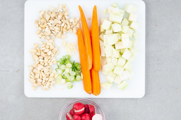 Den Backofen mit Grillfunktion auf 250°C vorheizen. Den Kohlrabi schälen und in 1–2cm große Würfel schneiden. Die Karotte schälen, längs vierteln und quer halbieren. Die Radieschen putzen und halbieren. Die Lauchzwiebel in Ringe schneiden. Den Knoblauch schälen und fein würfeln. Die Cashews und die Mandeln grob hacken.
