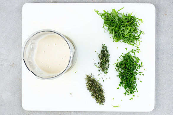 Die gekochten Cashews und Mandeln mitsamt der Brühe in einem hohen Gefäß mit einem Stabmixer sehr fein pürieren. Die Kräuter möglichst fein hacken, eine Handvoll Kräuter für die Garnitur beiseitelegen.