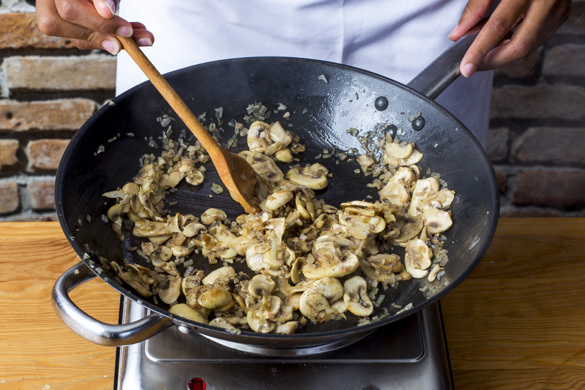 Die Pilze, die Schalotten und den Knoblauch in einer großen Pfanne mit 2EL Olivenöl bei starker Hitze 4–5Min. anbraten.