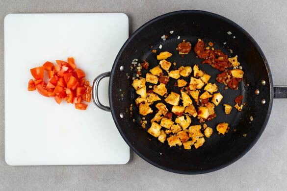 Die Zwiebeln mit 2TL Pflanzenöl in die Pfanne geben und ca. 2Min. mitbraten, bis sie weich und glasig sind. Die Tomaten in grobe Stücke schneiden. Die ½ der Currypaste oder mehr nach Geschmack in die Pfanne rühren und bei mittlerer Hitze 1–2Min. anbraten.