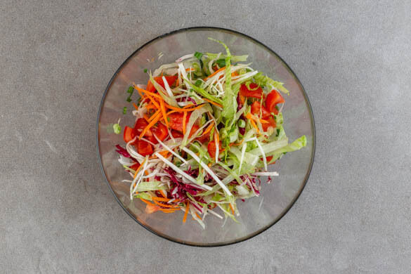 ½TL Salz in 1½EL Essig auflösen. Die Tomaten grob würfeln. Die Lauchzwiebeln in dünne Ringe schneiden. Die Salatmischung, die Tomaten und die Lauchzwiebeln mit dem Würzessig vermengen.
