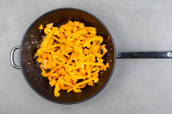 Die Süßkartoffeln, die Paprika und die gehackten Lauchzwiebeln in einer großen Pfanne mit 2EL Pflanzenöl bei mittlerer Hitze 4–6Min. anbraten.