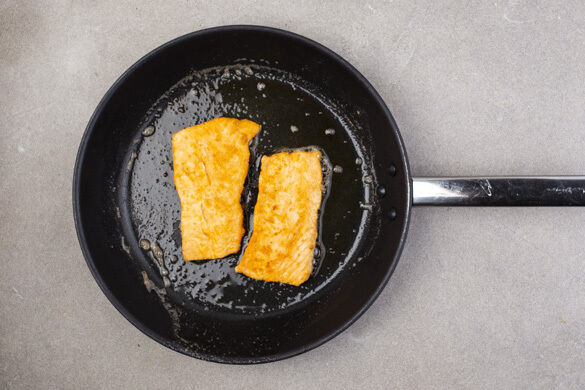 Ggf. überschüssiges Mehl abschütteln und den Lachs auf der Haut in einer großen Pfanne mit 1EL Olivenöl oder Butter bei mittlerer Hitze ca. 4Min. kross anbraten, dann wenden und weitere ca. 2Min. braten. Der Fisch muss noch nicht vollständig durchgegart sein. Aus der Pfanne nehmen und beiseitestellen, die Pfanne nicht auswischen.