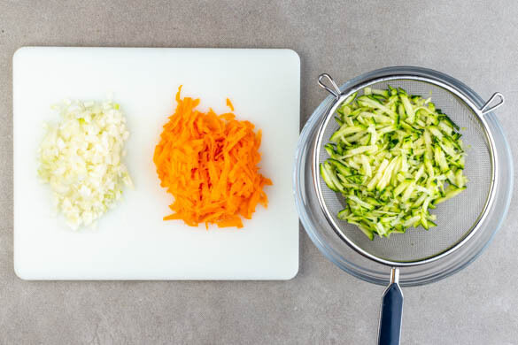 Den Backofen auf 220°C (200°C Umluft) vorheizen. Die Karotten ggf. schälen und mit einer Küchenreibe grob raspeln. Die Zucchini ebenfalls grob raspeln und in einem Sieb die überschüssige Flüssigkeit gut auspressen. Die Zwiebel schälen, halbieren und fein würfeln.