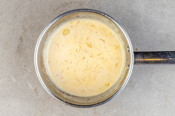 Die Zwiebeln mit der Béchamelsauce und 200ml Milch vermengen und zum Kochen bringen. Dann vom Herd nehmen und die Sauce mit Salz und Pfeffer abschmecken.