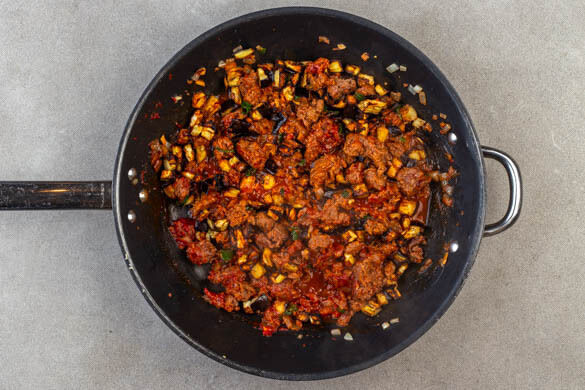 Die Minzeblätter grob schneiden. Das Tomatenmark, die Auberginen, die ½ der Minze und 50–100ml Wasser unter das Hack rühren. Die Sauce unter Rühren einköcheln lassen und mit Salz und Pfeffer abschmecken. Die Gnocchi mit der Sauce und dem Joghurt anrichten, mit den Pinienkernen und der restlichen Minze garnieren und mit dem Gurkensalat servieren.