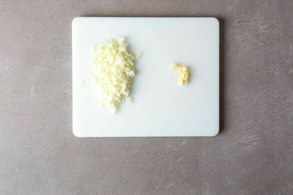 Die Zwiebel schälen, halbieren und grob würfeln. Den Knoblauch schälen und halbieren, eine Hälfte grob würfeln, die andere Hälfte fein würfeln.