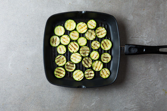 Die Zucchini in ca. 0,5cm dünne Scheiben schneiden und mit 1EL Olivenöl vermengen. In einer Grillpfanne bei starker Hitze auf jeder Seite ca. 2Min. anbraten, bis deutliche Grillstreifen zu sehen sind. Die Zucchinischeiben aus der Pfanne nehmen und mit Salz und Pfeffer würzen. Tipp: Wer keine Grillpfanne hat, kann auch eine normale Pfanne verwenden.