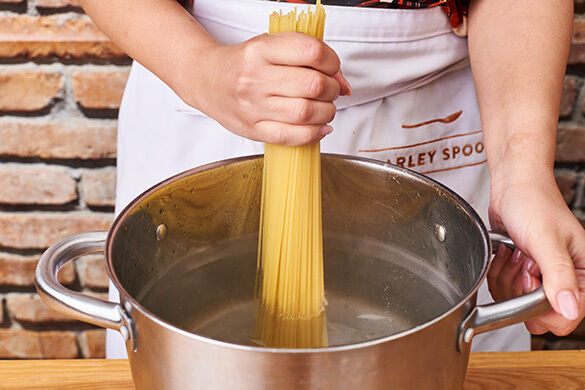 Die Pasta in das kochende Wasser geben und in 6–8Min. bissfest kochen. Ca. 150ml Pastawasser abschöpfen, dann die Pasta in ein Sieb abgießen und kalt abschrecken.