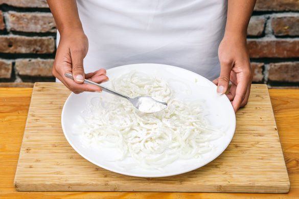 Die Zwiebel schälen, halbieren und in sehr dünne Streifen schneiden. Die Zwiebelstreifen mit den Fingern voneinander trennen, auf einem großen Teller mit 1EL Mehl bestäuben und gut vermengen.
