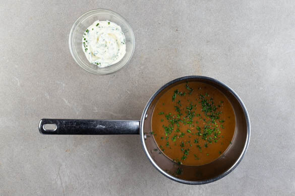 Den Knoblauch schälen und fein würfeln. Das Steinpilzpulver und ½EL Mehl in einem kleinen Topf mit ½EL Butter bei niedriger Hitze ca. 2Min. unter Rühren erwärmen. Den Knoblauch und 300ml heißes Wasser hinzufügen, kräftig mit Pfeffer würzen und aufkochen. Dann die Sauce bei niedriger Hitze 10–12Min. köcheln lassen, dabei gelegentlich umrühren.