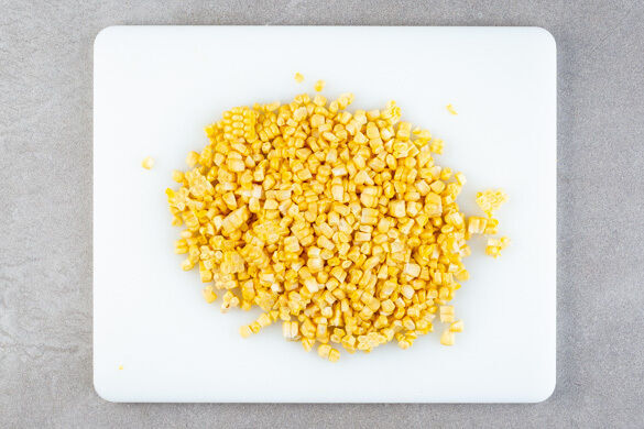 Den Fenchel längs halbieren und in ca. 1cm breite Streifen schneiden, dabei den Strunk entfernen. Ggf. vorhandenes Fenchelgrün fein schneiden und für die Garnitur beiseitelegen. Den Mais in einem Sieb kalt abspülen und abtropfen lassen.