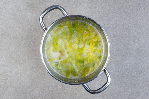 Den Fenchel und den Lauch mit je ½TL Salz und Pfeffer in einem großen Topf mit 4EL Olivenöl bei mittlerer Hitze ca. 5Min. braten, bis das Gemüse weich ist. 4TL Mehl einrühren und ca. 1Min. anschwitzen. 1,2L Wasser mit 2EL Essig und dem Brühgewürz in den Topf geben und abgedeckt zum Kochen bringen, dann die Hitze reduzieren und ca. 10Min. weiterkochen.