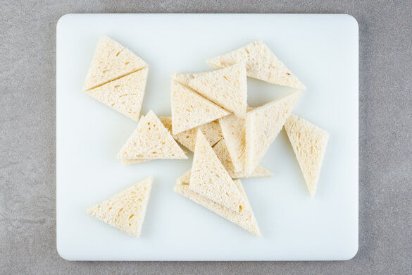 Die Toastbrotscheiben in jeweils 4 Dreiecke schneiden, dabei die Ränder dünn abschneiden.