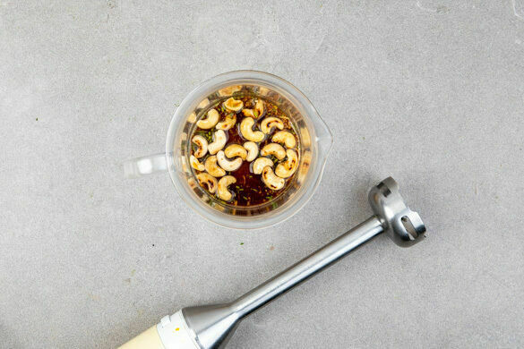 Die ½ der Cashewkerne mit der restlichen Sojasauce, dem Ingwer, den Korianderstielen, 1EL Zucker, 2–3EL Limettensaft, 4EL Pflanzenöl und 2EL Essig in einem hohen Gefäß mit einem Stabmixer zu einem leicht dickflüssigen Dressing pürieren. Nach Belieben mit mehr Limettensaft sowie Salz und Pfeffer abschmecken.