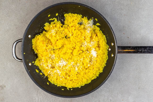 Die ½ des Knoblauchs mit 2TL Olivenöl in einer großen Pfanne bei schwacher bis mittlerer Hitze ca. 1Min. anbraten. Den Reis zugeben und ca. 2Min. mitbraten. Den Safran samt Wasser einrühren und ca. 1Min. mitbraten. Nach und nach mit der Brühe ablöschen und stetig rühren. Diesen Vorgang 18–20Min. lang wiederholen, bis die Brühe aufgebraucht und der Reis bissfest ist.