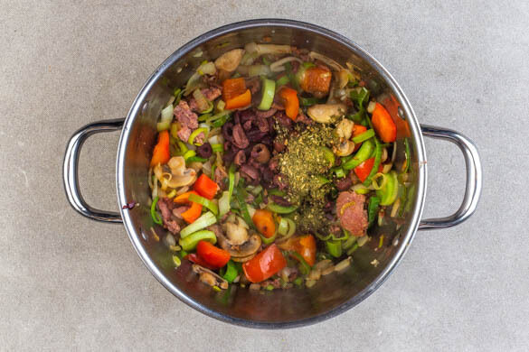 Den Gemüsemix mit 1TL Salz zugeben und 3–5Min. mitgaren.