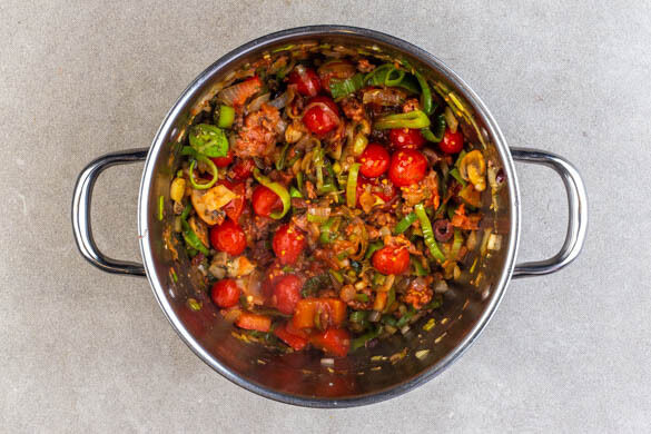Die Tomaten unterrühren. Die Flüssigkeit aufkochen und die Sauce ca. 3Min. köcheln lassen.