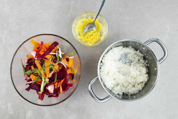 Die Karotten und die gelben Beten schälen und mit dem Sparschäler in lange Streifen schneiden. 3EL hellen Essig mit 1EL Zucker und 1TL Salz verrühren, unter die Gemüsestreifen mischen und beiseitestellen. Die Lauchzwiebeln schräg in feine Ringe schneiden.