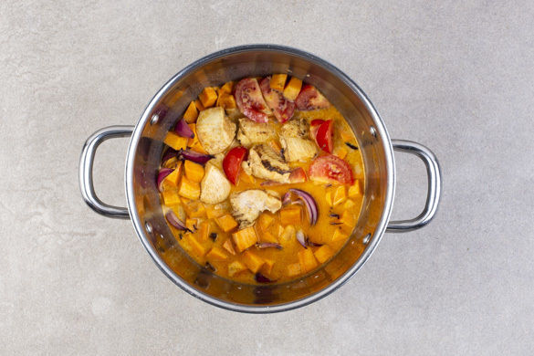 Die Zwiebeln in einem mittelgroßen Topf mit 1EL Pflanzenöl bei mittlerer Hitze 1–2Min. anbraten. Den Ingwer und das vegane Hähnchen samt Marinade hinzugeben und 3–5Min. anbraten. Die Tomaten und die Süßkartoffeln unterrühren und 1–2Min. mitbraten. Mit der Kokosmilch ablöschen.
