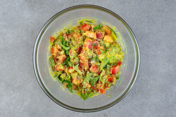 Die restlichen Zwiebeln mit den Tomaten, der Guacamole und ca. ¾ des Korianders vermengen. Mit 2EL Essig sowie Salz, Pfeffer und 1 Prise Zucker würzen.