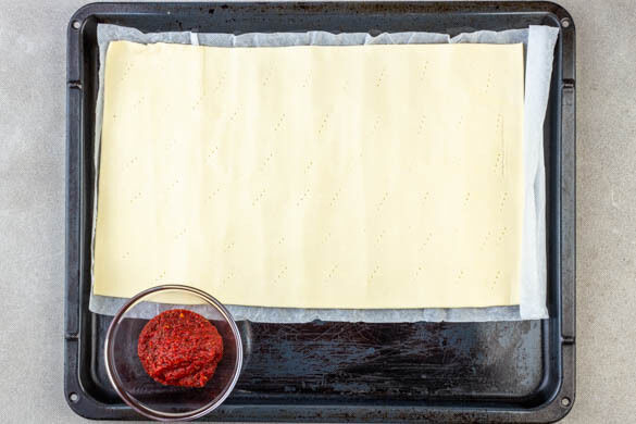 Das Tomatenmark mit der Gewürzmischung, 2EL Olivenöl, 4EL Wasser sowie je 1 kräftigen Prise Salz und Pfeffer zu einer Sauce verrühren. Die Teige mit dem Papier nach unten auf zwei Backblechen ausrollen und mit einer Gabel mehrere Male einstechen.
