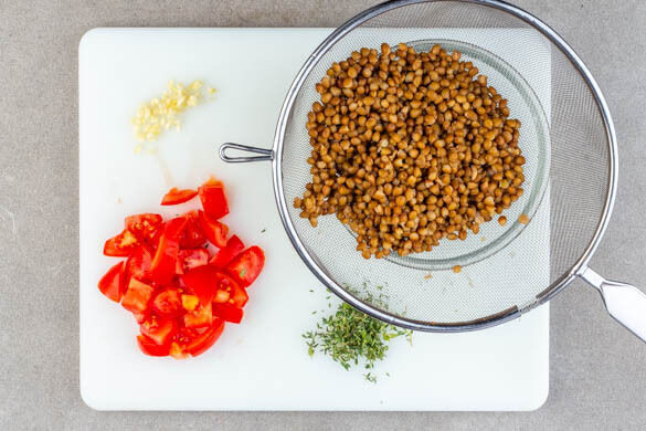 Die Linsen in einem Sieb mit kaltem Wasser abspülen und abtropfen lassen. Die Tomaten in ca. 2cm große Stücke schneiden. Den Knoblauch schälen und sehr fein würfeln oder durch eine Knoblauchpresse drücken. Die Thymianblättchen von den Stängeln streifen.