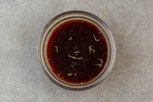 Die Limettenschale abreiben, dann die Limetten halbieren und auspressen. Den Limettensaft und die Sojasauce mit der Limettenschale, 2TL Zucker und 1½EL Mehl verrühren, dann 180ml kaltes Wasser nach und nach einrühren, damit sich keine Klumpen bilden.