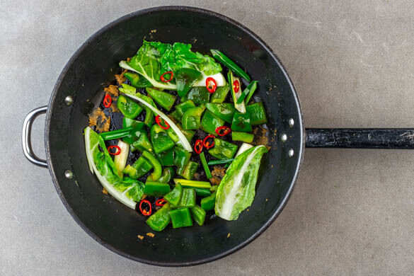 Die Knoblauch-Ingwer-Paste und die Peperoni nach Geschmack in einer großen Pfanne oder einem Wok mit 2EL Pflanzenöl bei starker Hitze ca. 1Min. anbraten, dann die Paprika, die Lauchzwiebeln und ggf. die Blumenkohlblätter zugeben und ca. 4Min. scharf anbraten, bis die Haut der Paprika beginnt, Blasen zu werfen.
