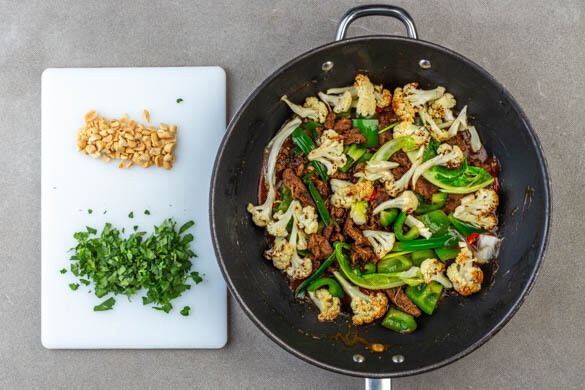 Den Koriander samt Stängeln grob schneiden. Die Erdnüsse grob hacken. Das Geschnetzelte in die Pfanne geben und in 2–3Min. stark erhitzen, dann die Sauce einrühren, die Pfanne vom Herd nehmen und den gerösteten Blumenkohl unterheben. Den Paprika-Rindfleisch-Wok auf Teller verteilen und mit dem Koriander und den Erdnüssen garniert servieren.