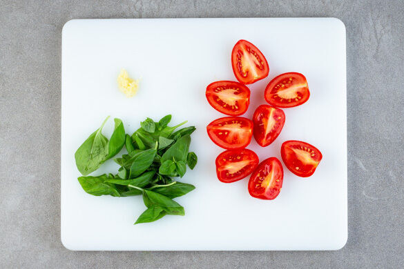 Den Backofen mit Grillfunktion oder Ober-/Unterhitze auf 220°C vorheizen. Die Tomaten vierteln. Die Basilikumblätter abzupfen. Tipp: Wer mag, kann die Stängel klein schneiden und in der Suppe mitkochen. Den Knoblauch schälen und fein würfeln.