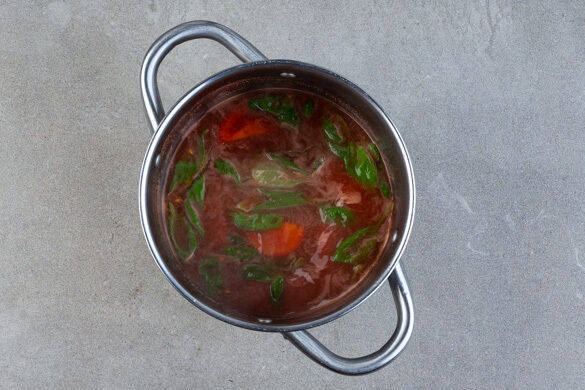 Die Tomaten, ca. ⅔ der Basilikumblätter, die passierten Tomaten und 500ml heißes Wasser in einem mittelgroßen Topf zum Kochen bringen. Das Brühgewürz unterrühren, mit Salz, Pfeffer und 1 Prise Zucker abschmecken und die Suppe bei mittlerer Hitze 10–15Min. sanft köcheln lassen.