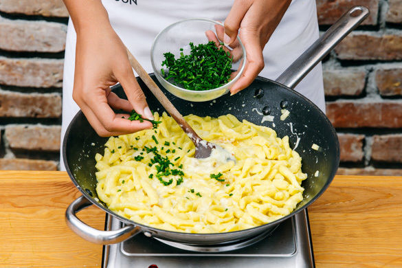 Die Pfanne auswischen und 350ml Wasser hineingießen. Das Brühgewürz einrühren und bei starker Hitze auflösen. Die Spätzle, den Hartkäse und den Gouda in die Pfanne geben und ca. 5Min. wenden, bis die Flüssigkeit verdampft ist und der Käse Fäden zieht. Mit Salz und Pfeffer abschmecken, dann die ½ des Schnittlauchs unterheben.