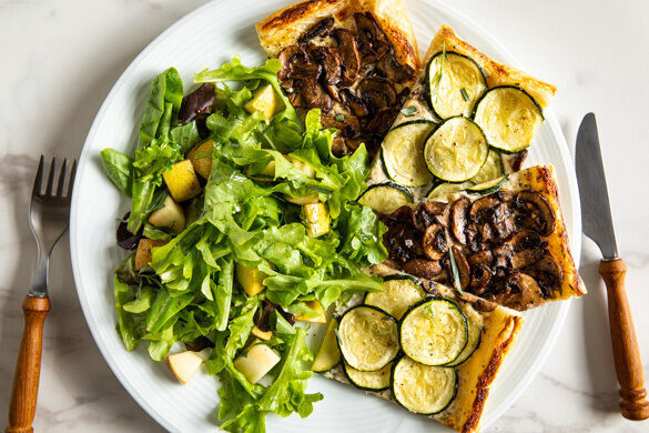 Herbstliche Tarte mit Pilzen und Zucchini dazu Salat mit Birne und Petersilie