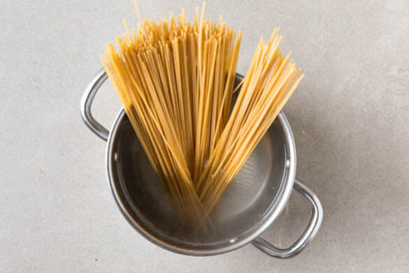 Die Pasta in das kochende Wasser geben und in 8–10Min. bissfest kochen. Mit einer Tasse etwas Pastawasser abschöpfen, dann die Pasta in ein Sieb abgießen und abtropfen lassen, dann zurück in den Topf geben und warm halten.